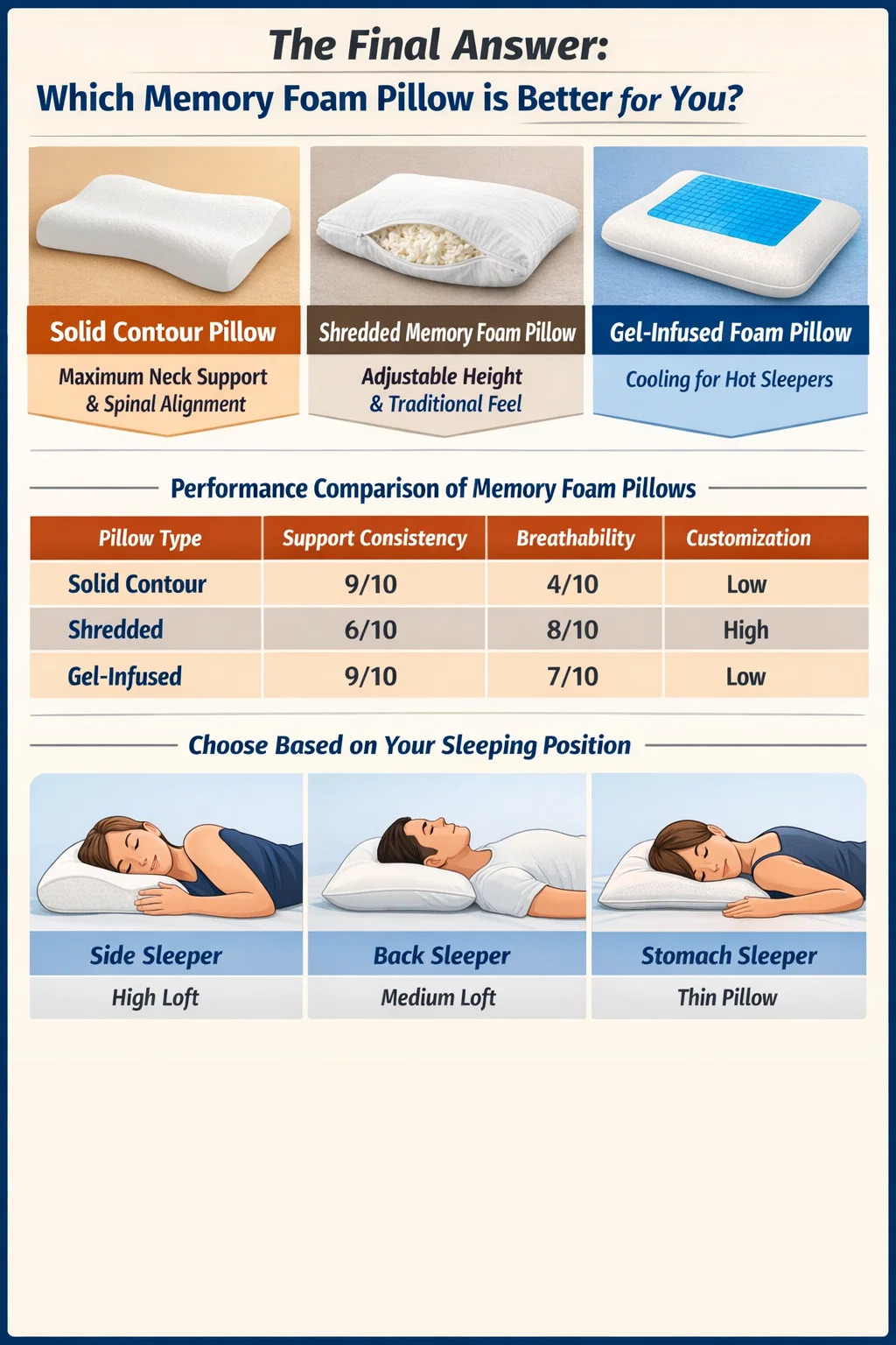Níl aon pillow "is fearr" amháin, ach tá buaiteoir soiléir bunaithe ar do nósanna codlata ar leith. Má thugann tú tosaíocht do thacaíocht muineál uasta agus ailíniú dromlaigh, a pillow cúr cuimhne comhrian soladach is fearr. Más fearr leat mothú traidisiúnta leis an gcumas an airde a choigeartú, a pillow cúr cuimhne shredded Is é an rogha is fearr. Dóibh siúd a dhúisíonn sweating go minic, a pillow cúr cuimhne glóthach-insileadh nó cille oscailte Is é an t-aon rogha inmharthana chun róthéamh a chosc.